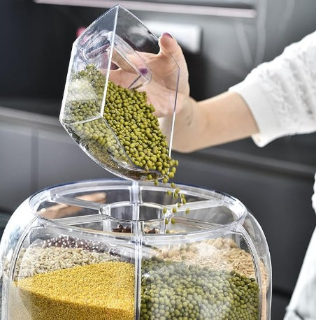 Su diseño giratorio permite acceder fácilmente a cualquiera de los 6 compartimentos con solo deslizar la base. Gracias a su sistema de dispensación por presión, puedes obtener solo la cantidad necesaria sin abrir tapas constantemente, evitando la exposición al aire y manteniendo los granos frescos por más tiempo.